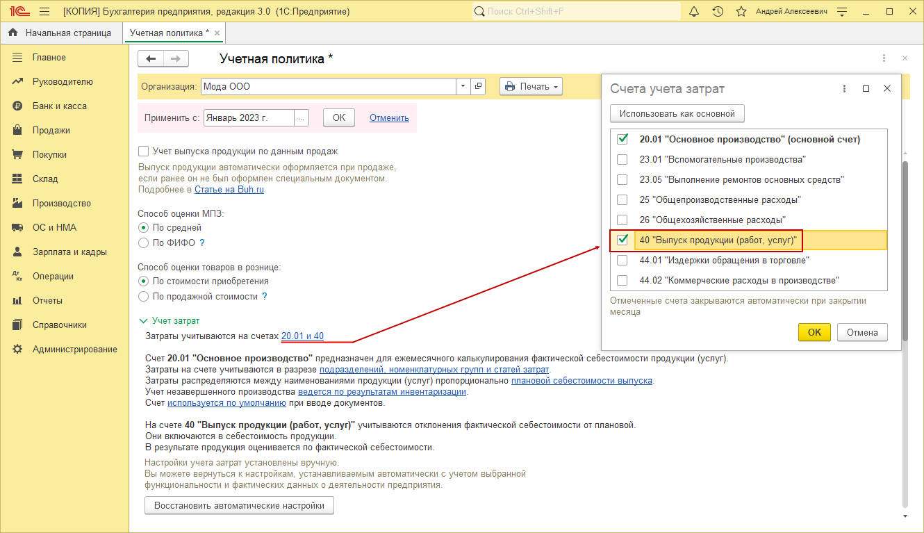 Настройка порядка учета себестоимости выпуска выполняется в форме «Учетная политика»: