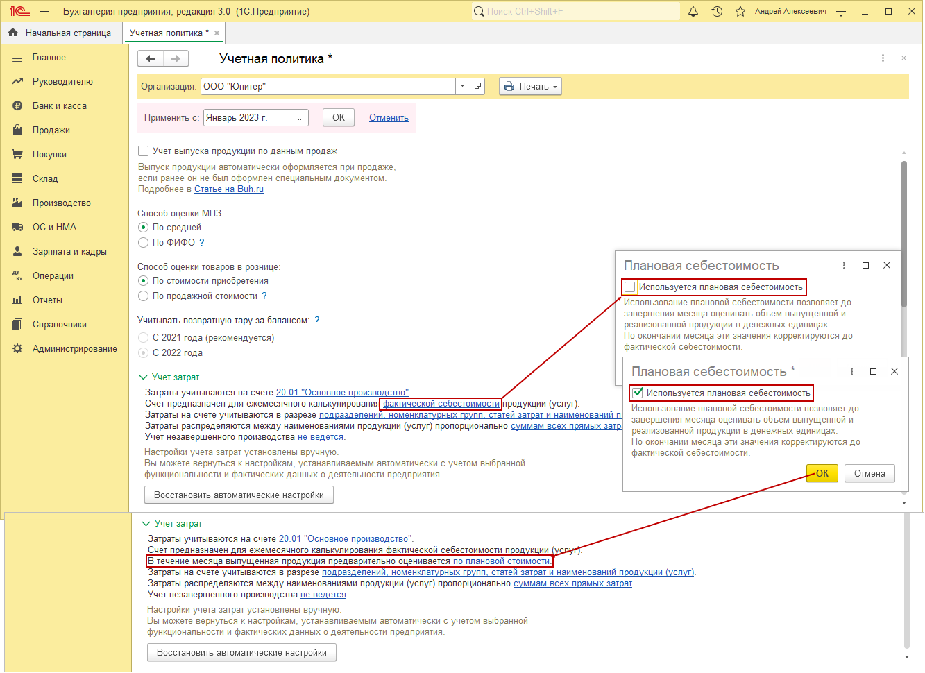 2) Установить в параметрах учета тип плановых цен «Плановая (выпуск)»