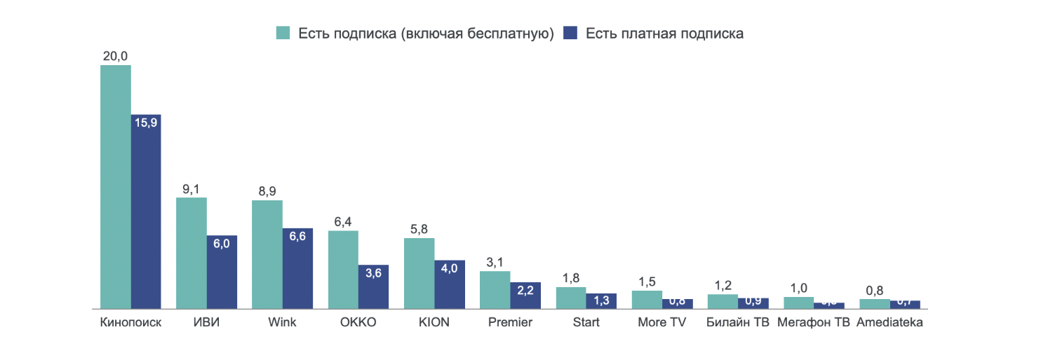 Лидером среди онлайн-кинотеатров как по общему количеству подписчиков, так и по пользователям с платной подпиской остается «Кинопоиск». По данным GfK, число подписчиков «Кинопоиска» в третьем квартале выросло по сравнению со вторым кварталом с 18,6% до 20% городских жителей. Исторический максимум у «Кинопоиска» аналитики зафиксировали по платящим подписчикам — 15,9% в третьем квартале против 13,8% во втором квартале соответственно. Второе и третье место рейтинга с лета 2022 года делят онлайн-кинотеатры «Иви» и Wink. «Иви» опережает Wink по общему числу подписчиков — 9,1% горожан против 8,9%. При этом уступает ему по числу платящих подписчиков — 6% против 6,6% соответственно.