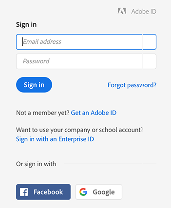 Войдите в систему с помощью своего Adobe ID и пароля либо учетной записи социальной сети Facebook или Google.