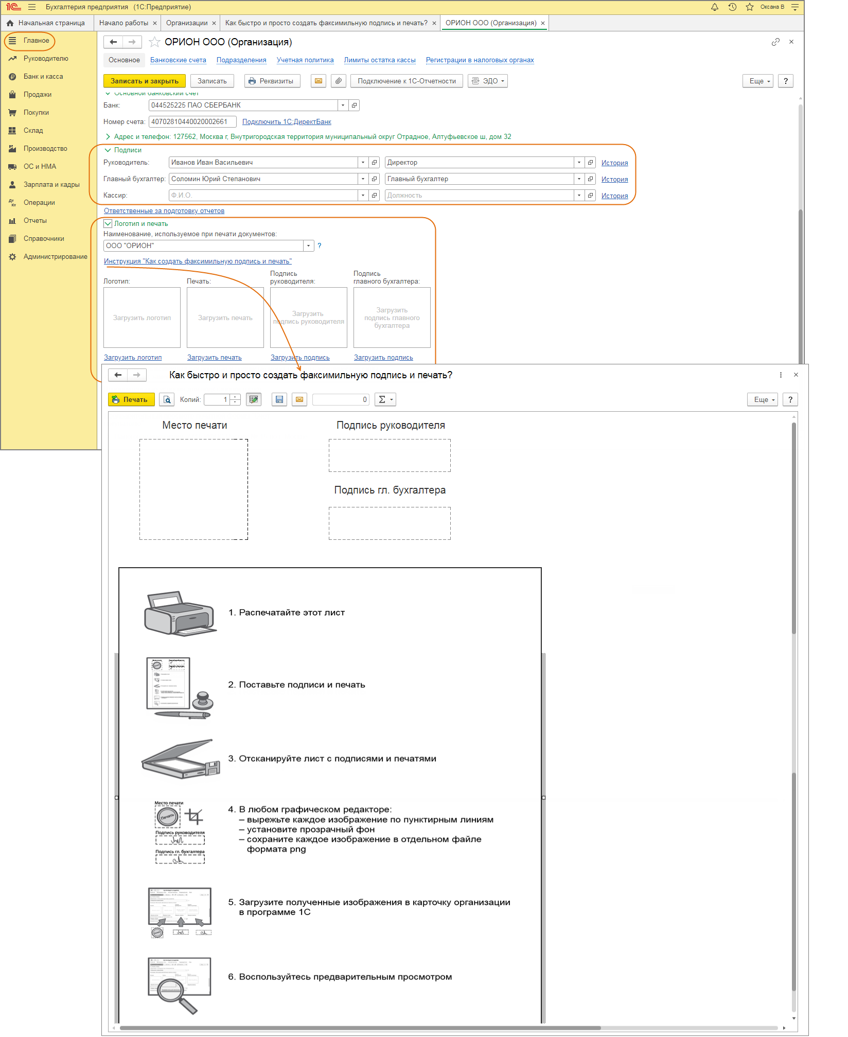 - Для создания файлов с образцами подписей и оттиском печати организации можно перейти по ссылке: Инструкция «Как создать факсимильную подпись и печать».