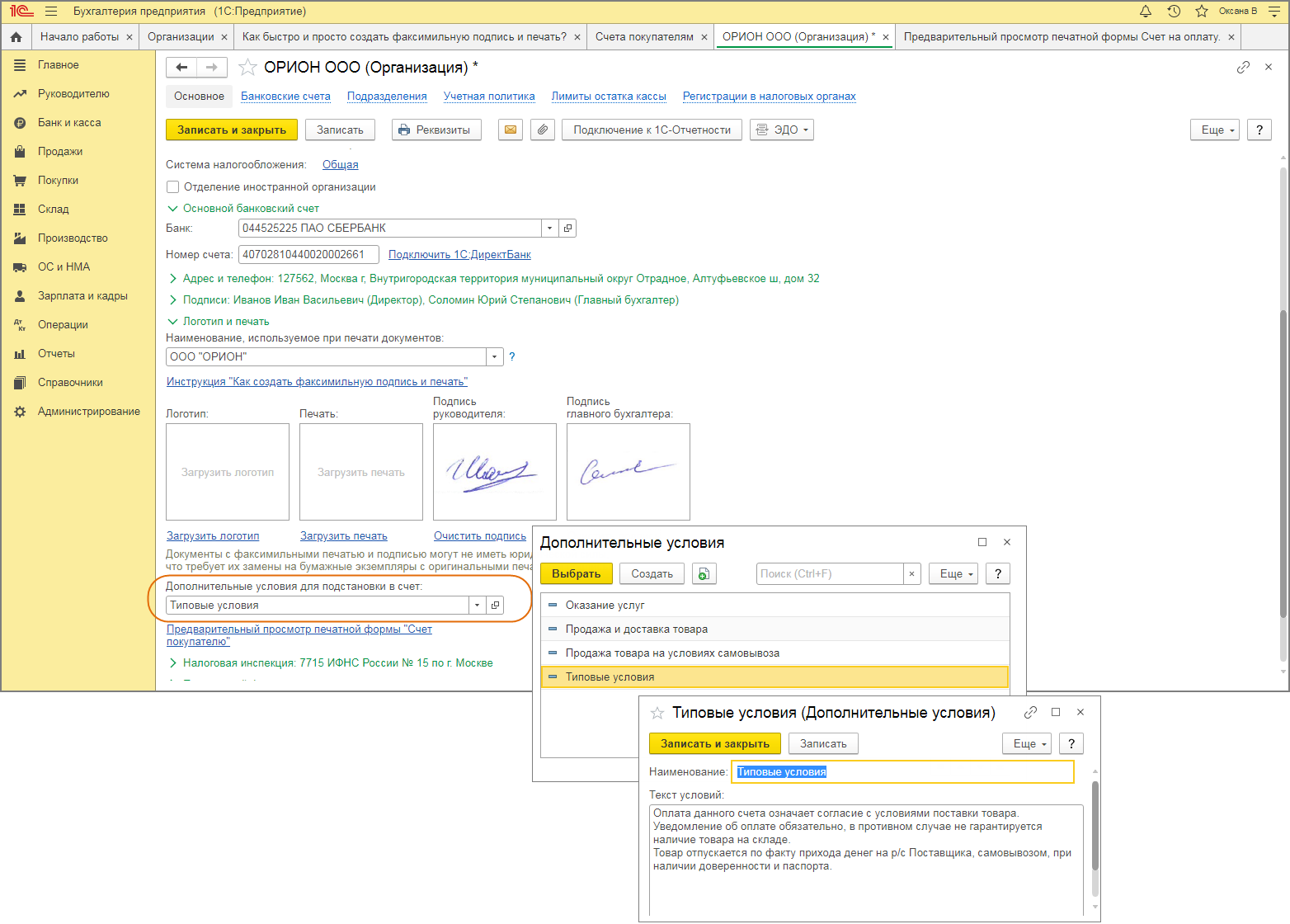 Обратите внимание, что для отображения факсимиле сотрудника в документах необходимо, чтобы в карточке организации была настроена хотя бы одна факсимильная подпись. В противном случае флажок «Подпись и печать» не доступен для редактирования.