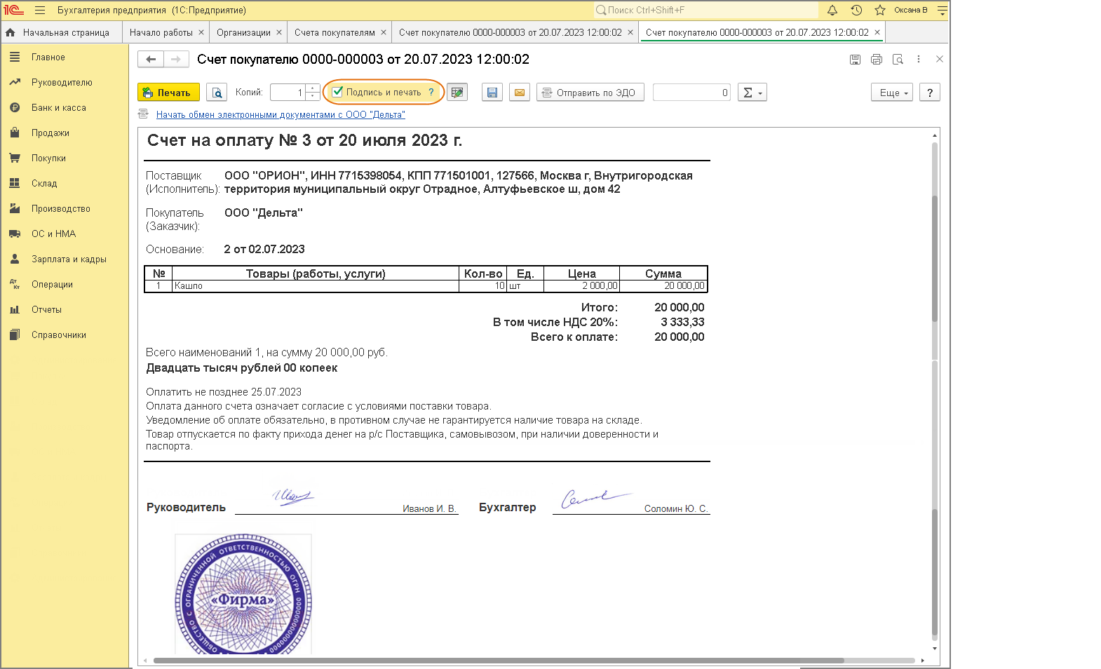 Для печати документов (счета покупателю, товарной накладной) с факсимиле, настроенными в карточке организации, и оттиском печати установите флажок «Подпись и печать» в печатной форме документа (рис. 4). По умолчанию в печатных формах документов указываются факсимиле из карточки организации.