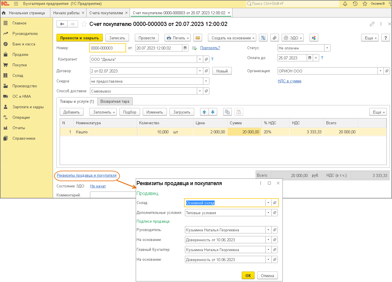 Чтобы в документе «Счет покупателю» установить факсимиле сотрудника (из справочника «Сотрудники»), перед открытием печатной формы перейдите по ссылке «Реквизиты продавца и покупателя» и выберите сотрудника в полях «Руководитель» и (или) «Главный бухгалтер» (рис. 5). Затем откройте печатную форму (по кнопке «Печать») и установите флажок «Подпись и печать».