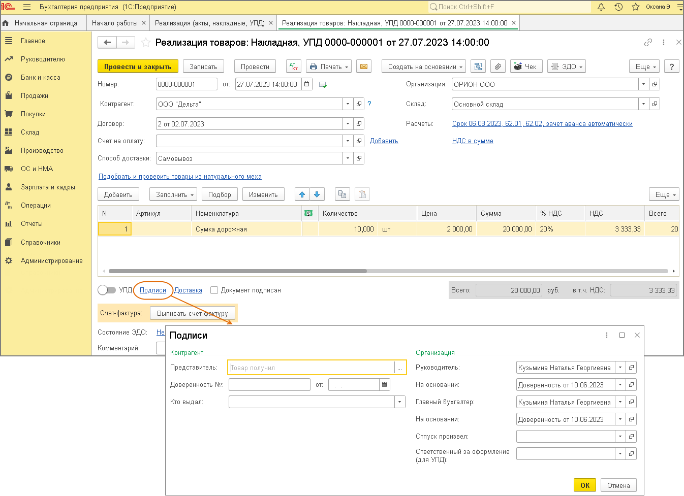 Чтобы в документе «Реализация (акт, накладная, УПД)» установить факсимиле сотрудника (из справочника «Сотрудники»), перед открытием печатной формы перейдите по ссылке «Подписи» и выберите сотрудника в полях «Руководитель» и (или) «Главный бухгалтер» и (или) «Отпуск произвел» (рис. 6). Затем откройте печатную форму (по кнопке «Печать») и установите флажок «Подпись и печать».