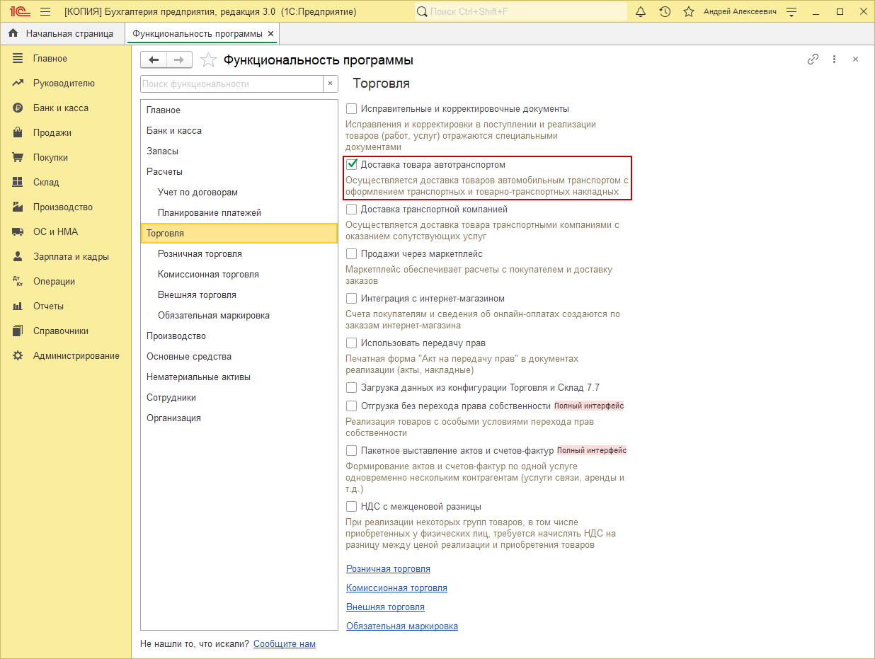 Если доставка товаров осуществляется автотранспортом, то для оформления при реализации транспортных и товарно-транспортных накладных в форме «Функциональность программы» на закладке «Торговля» поставьте флажок «Доставка товара автотранспортом» (раздел: Главное – Функциональность) (рис. 1).