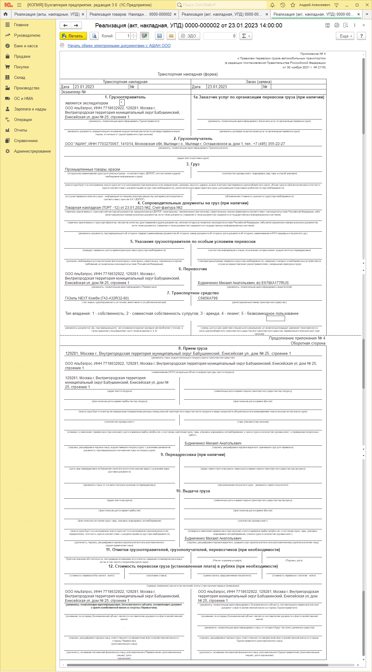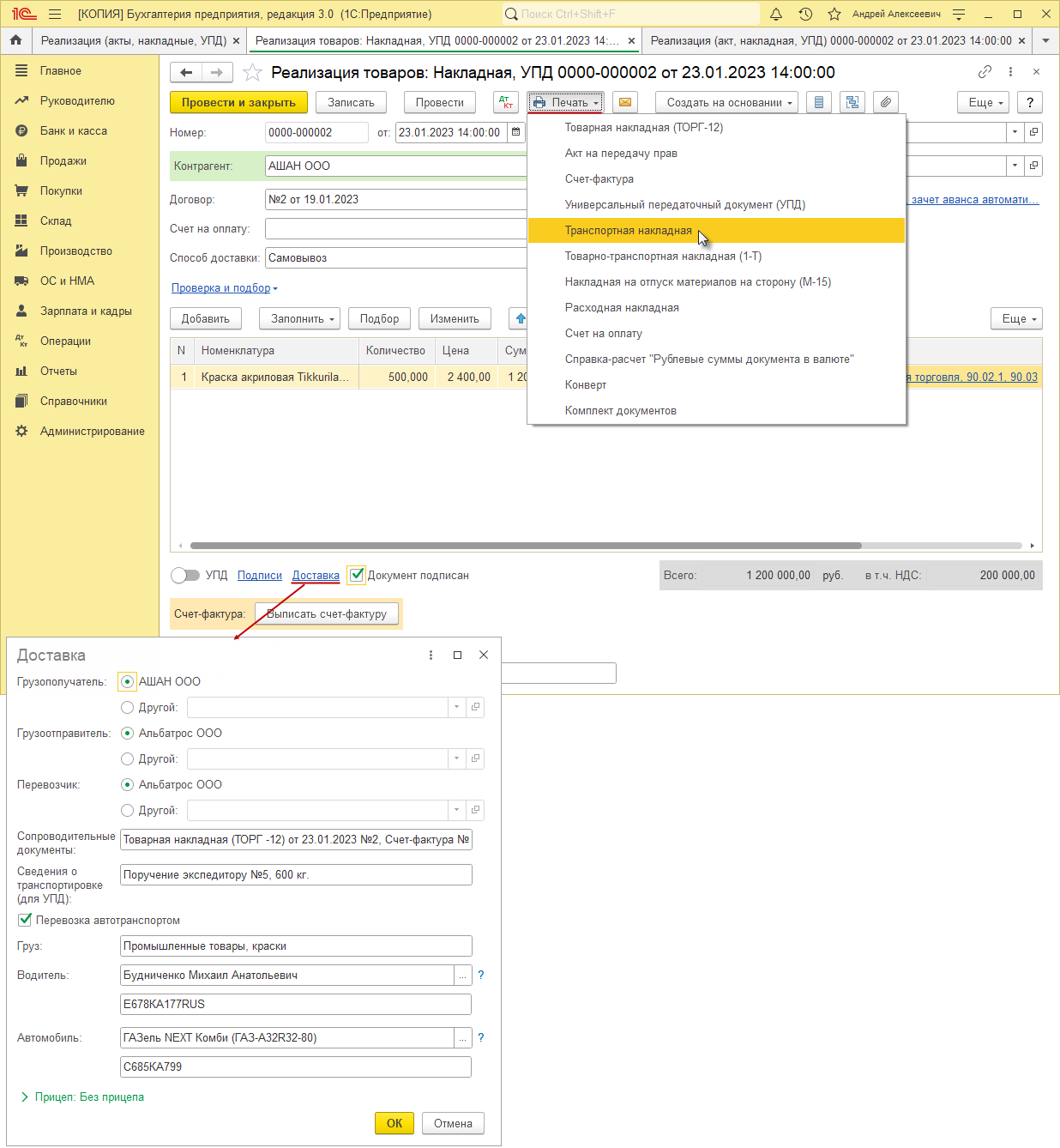Оформление и печать транспортной и товарно-транспортной накладных производится из документа «Реализация (акт, накладная, УПД)» (рис. 2):
