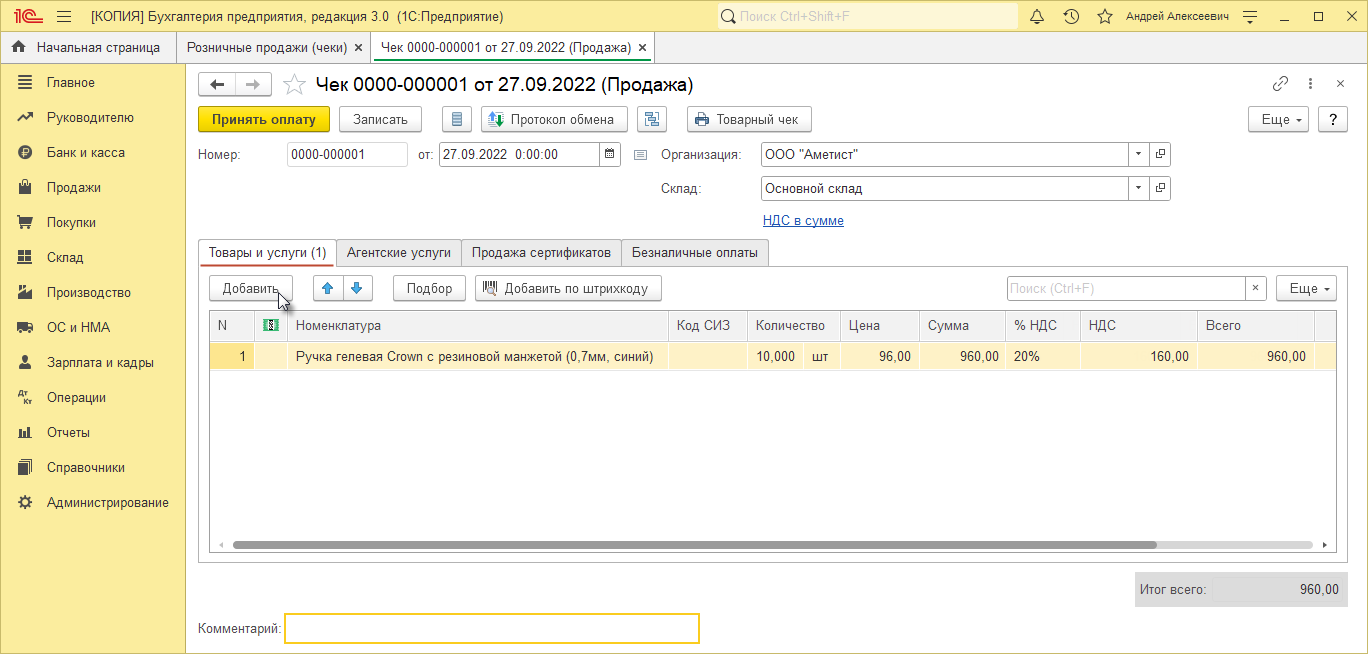 Для отражения оплаты и печати товарного и кассового чеков используется документ «Розничная продажа (чек)».