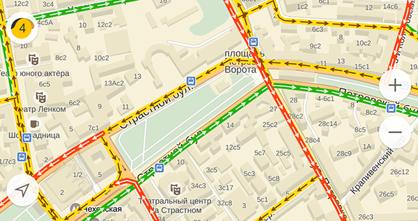 После объединения проверенных треков алгоритм анализирует их и выставляет «зелёные», «жёлтые» и «красные» оценки соответствующим участкам дорог. Эта схема отрисовывается на слое «Пробки Яндекс.Карты» — и в мобильном приложении, и на веб-сервисе.